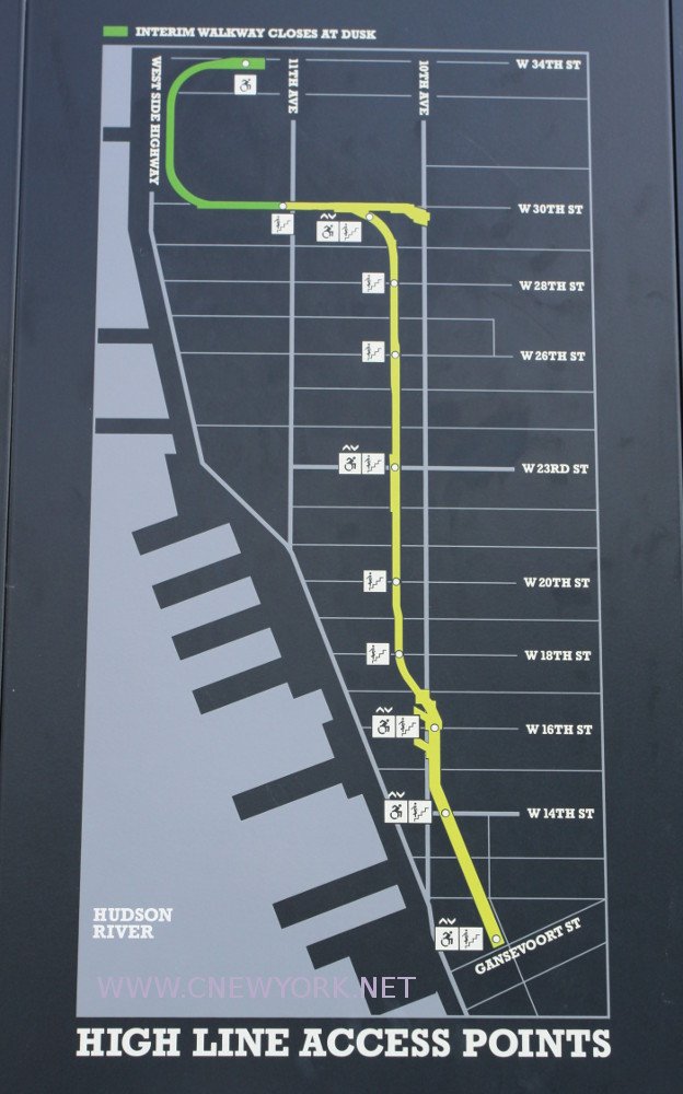 - La High Line est une promenade plantée longue de 2,3 km qui traverse les quartiers de Meatpacking District et Chelsea en suivant le tracé d’une ancienne ligne de chemin de fer surélevée. Cette ligne avait été créée en 1934 pour relier la 34th Street au St John’s Park Terminal, au niveau de Spring Street. A l’époque, les trains transportaient toutes sortes de marchandises dans ces quartiers industriels.