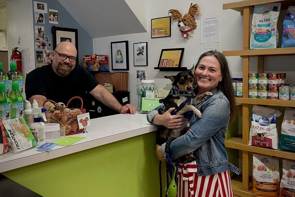 Des propriétaires de chiens devant la boutique Zoomies NYC. Adresse : 434 Hudson Street, New York.